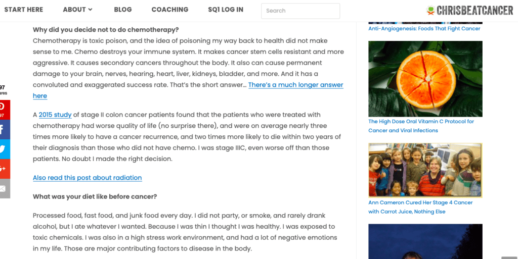 I literally see this sort of sales pitch every day. This predictable, cliched marketing ploy would be funny, if it wasn’t so sad that people are actually falling for it. He states very clearly that he doesn’t try to convince people to decline chemo, but this is mere semantics. He is doing just that by very fact that he repeatedly calls chemo ‘toxic’ and speaks out against it in favor of a plant-based diet.