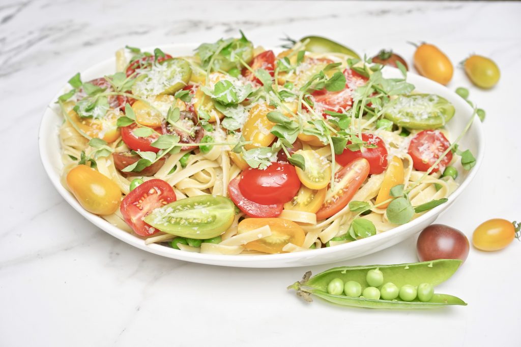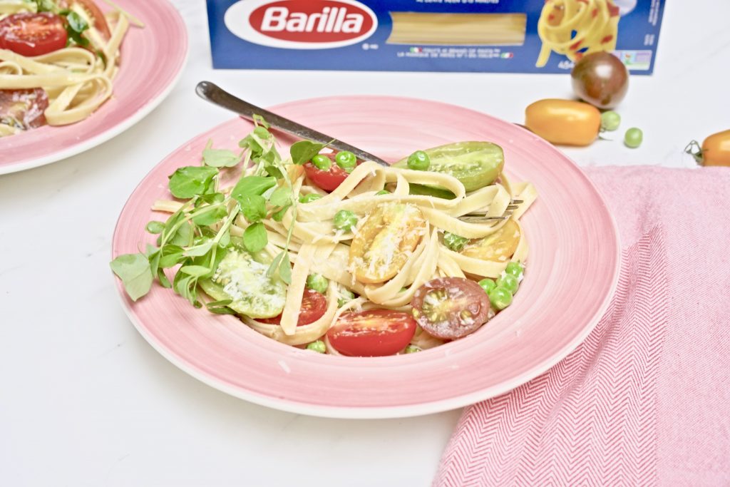 Take advantage of summer's bounty with this super-easy and fast pasta dish! The sweet tomatoes and bright green peas make this pasta as beautiful as it is delicious.