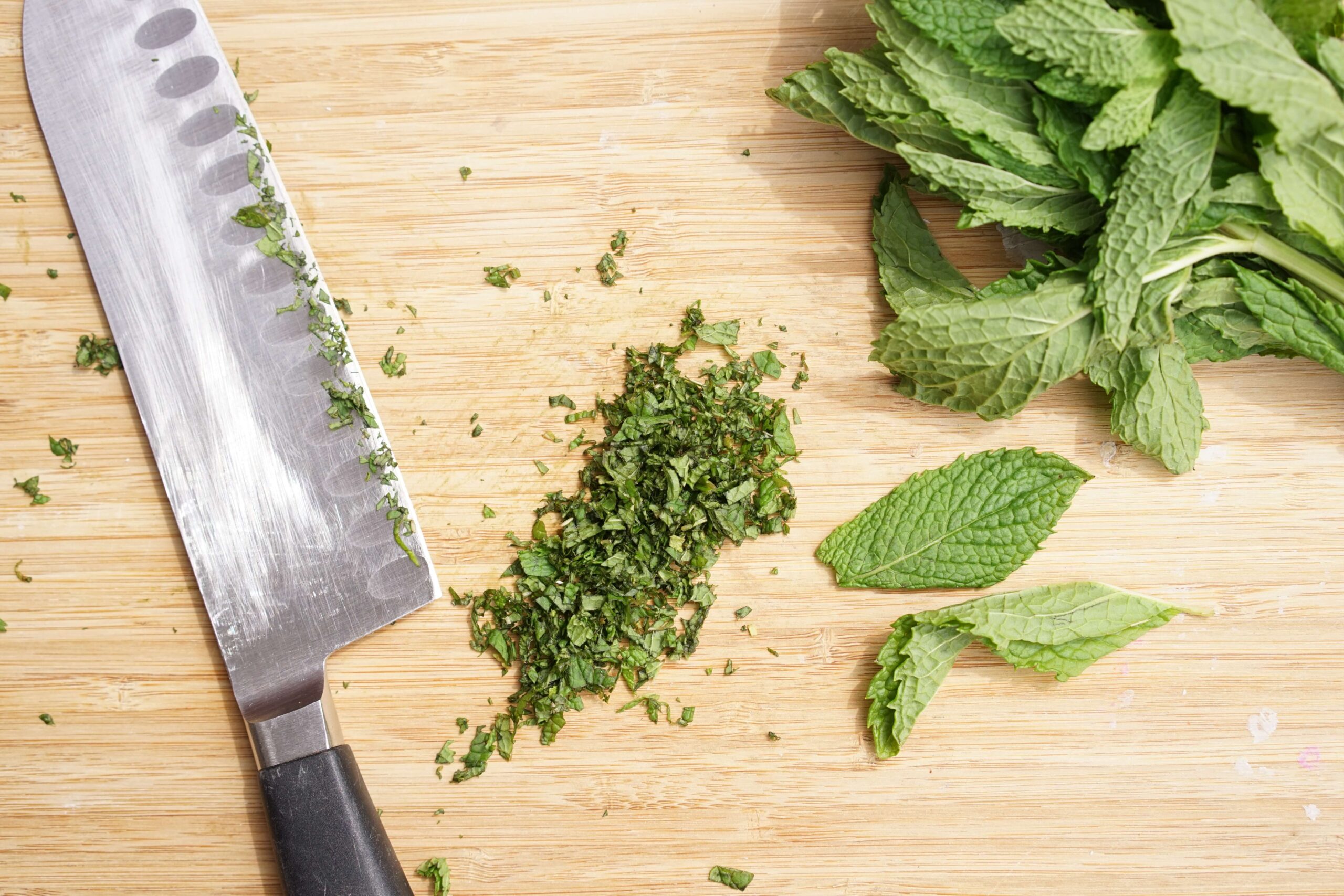 - Chop the mint leaves as finely as you can, then place in a measuring cup or small bowl. Add 1/4 cup of the fresh orange juice, and muddle the mint with the juice.