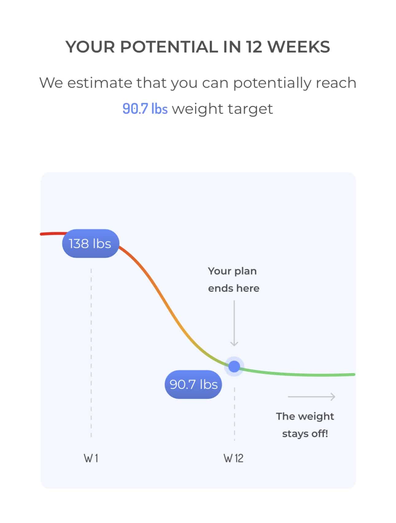 Finally, a slide with another graph tells me that Reverse Health is estimating I can reach a 90.7 lb target in 12 weeks (and that it will stay off!!).