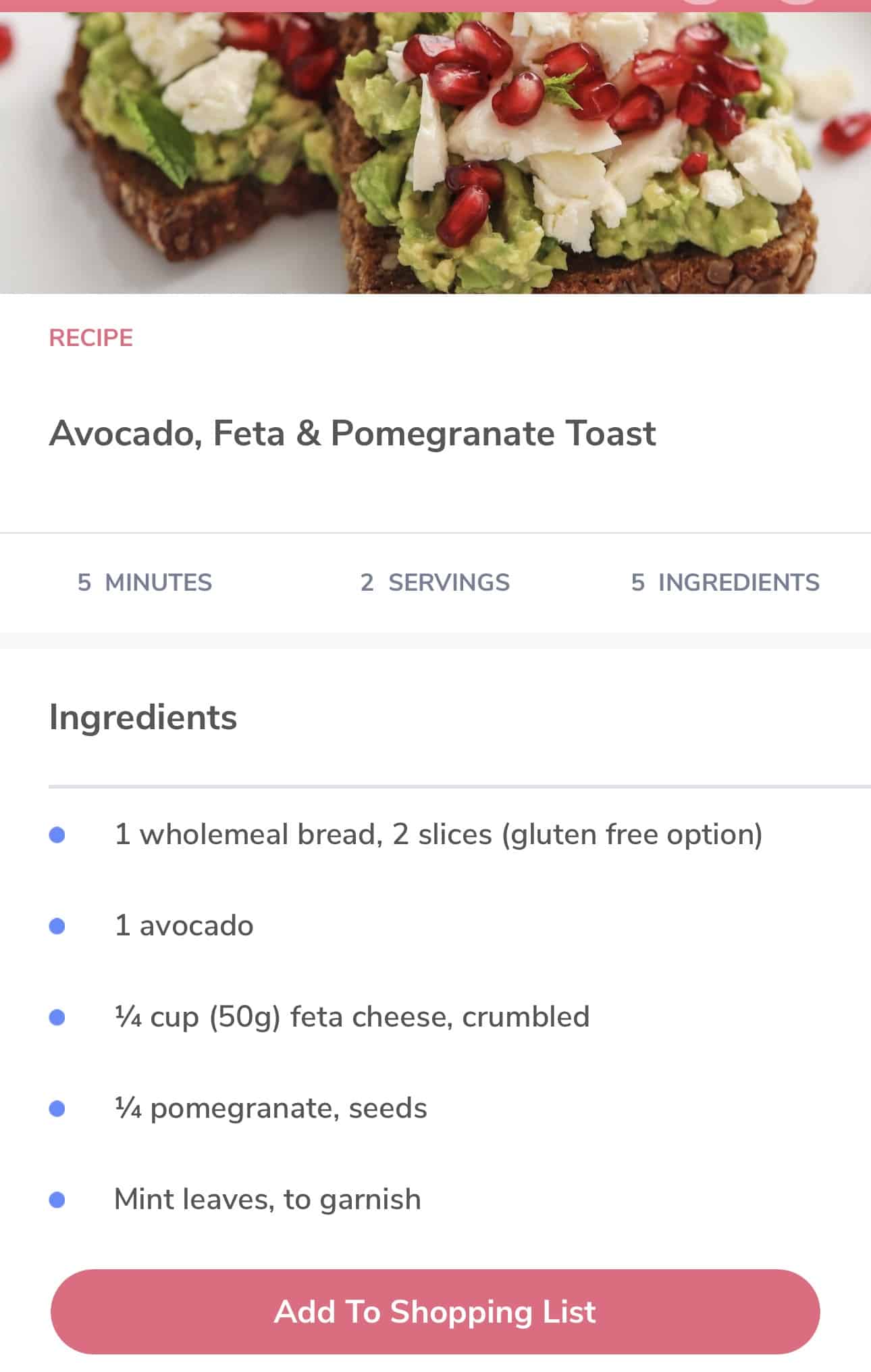 Breakfast โ avocado, feta & pomegranate toast โ 322cal/serving