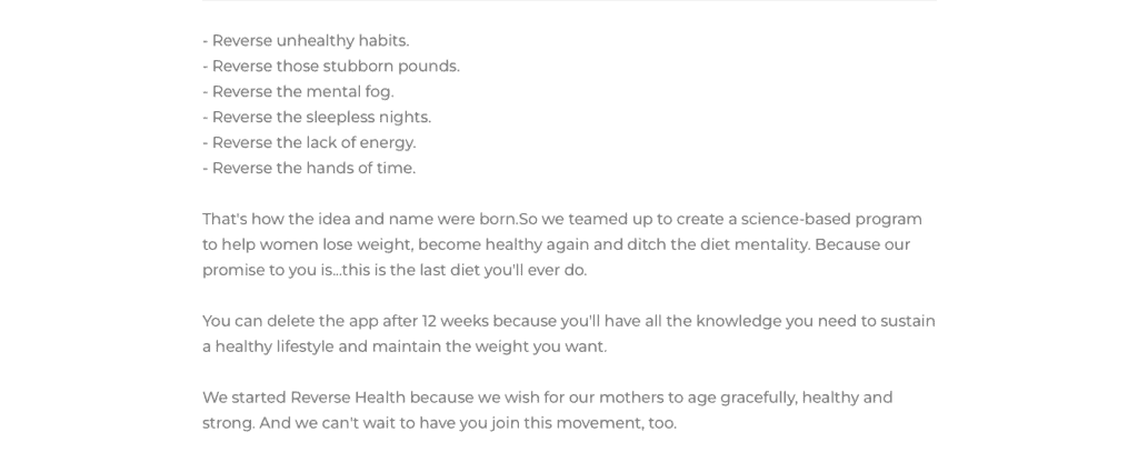 But wait! Right on the front page of the Reverse Health site, they say you can ‘delete the app after 12 weeks, because you have all the tools you need!’