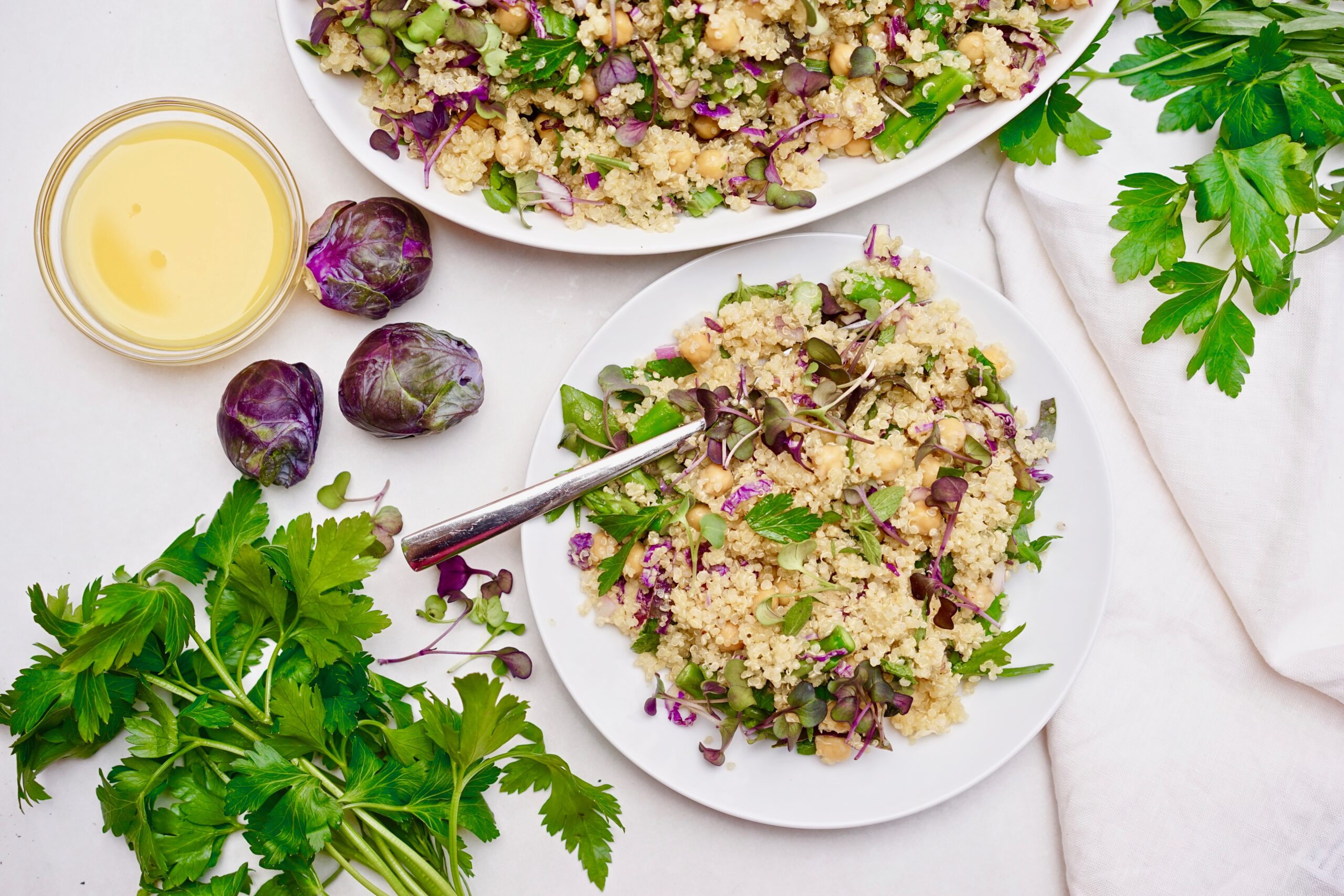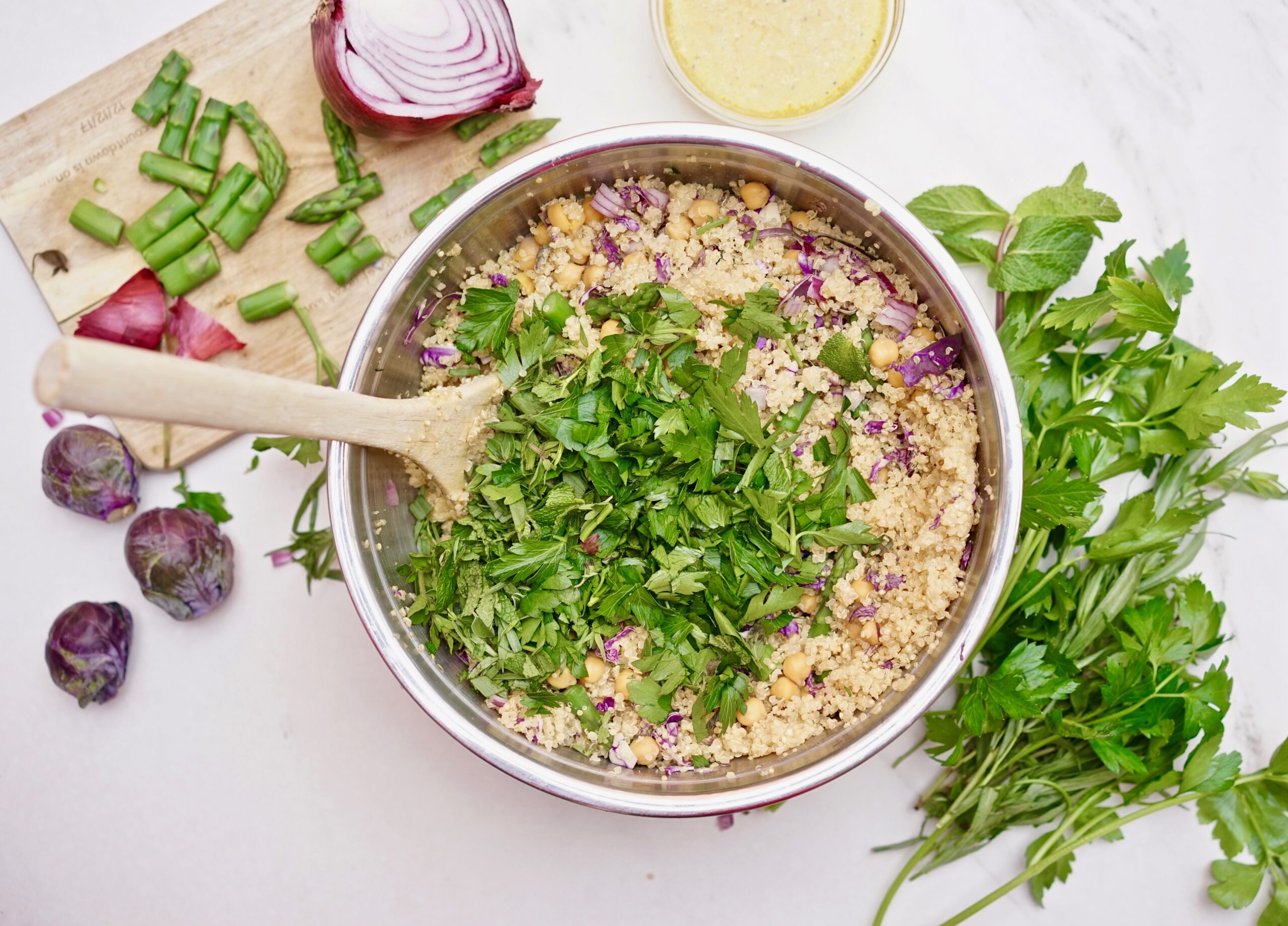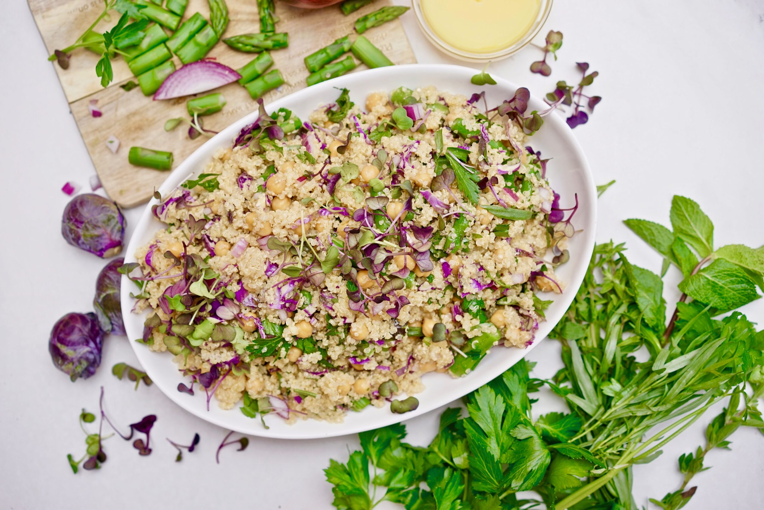 - 3 + cups of mixed vegetables: I used shredded purple Brussels sprouts steamed asparagus, red onion, and microgreens