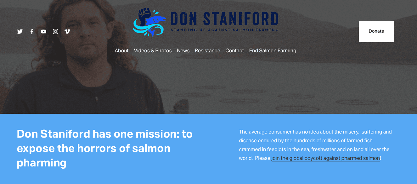 Moving from the horrible dangers of meat to whatโs awful about farmed fish, weโre introduced to more activists, one being Don Staniford, who campaigns against salmon farms. He tells us that โif people realized the full horrors of salmon farming theyโd avoid it like the proverbial plague.โ